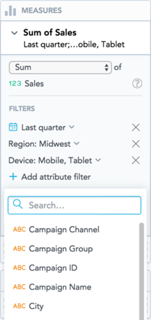 The resulting insight matches all the applied measure level filters—both measure AND attribute filters. For information about date filter interactions, see Filtering Measures by Date.