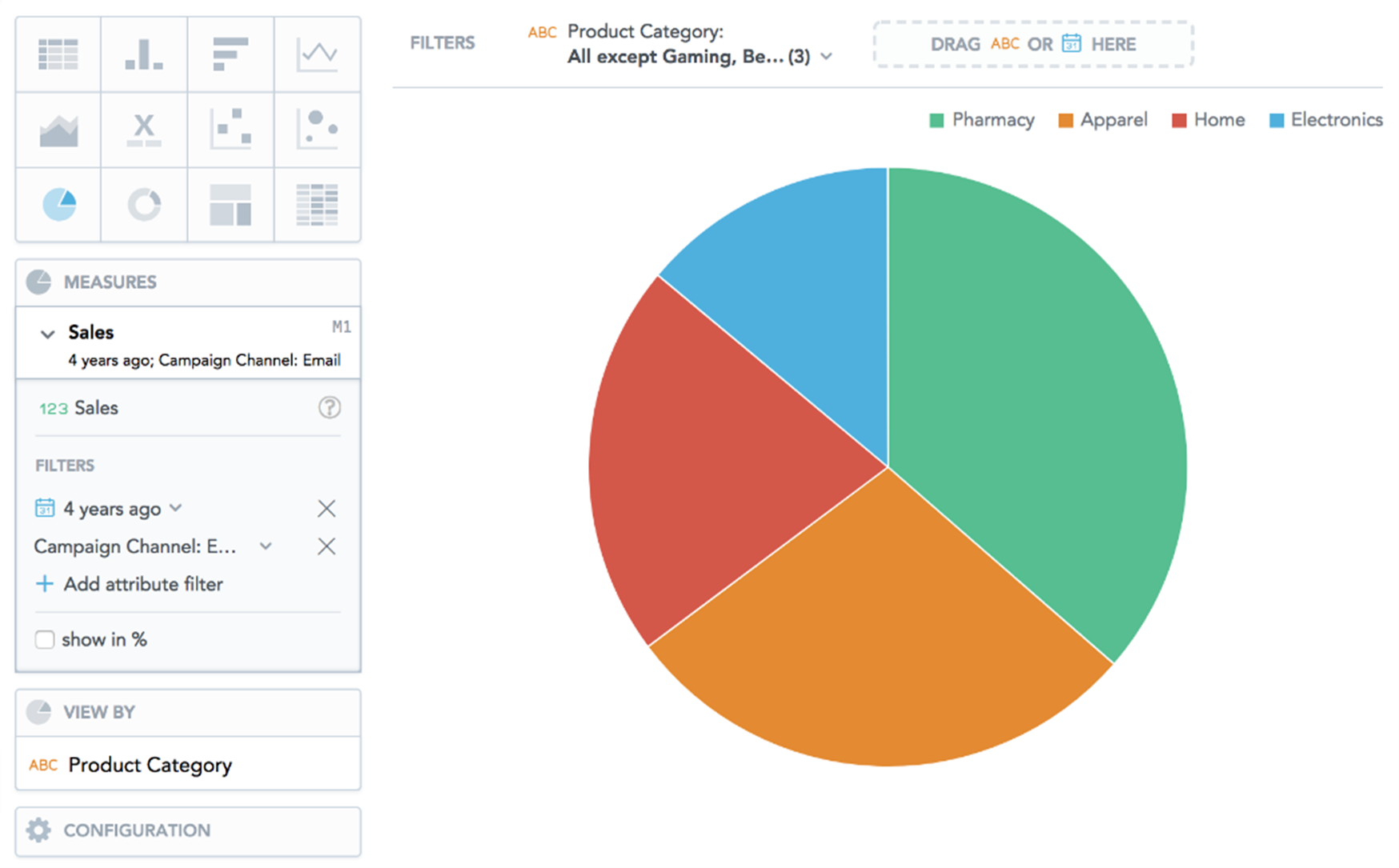 Pie charts have the following sections: Measures , View by , and Configuration .