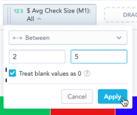 When you filter your data and the target values include zero, you can decide if the values that are null are included in the final filtered insight by selecting the Treat blank values as 0 checkbox.