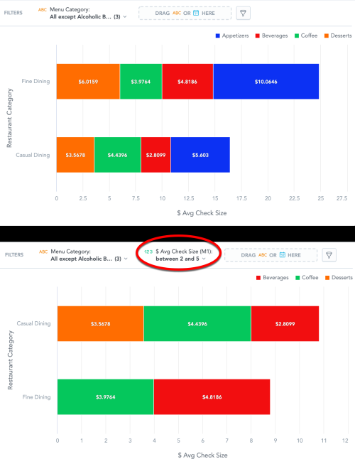 In the following example, the insight displays Average Check Size and the number of Owned Locations in different states and is filtered to display only the states with fewer than two owned locations.